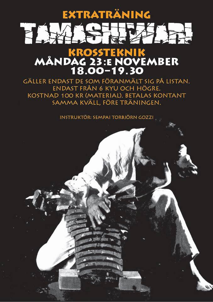 Måndag den 23 november är det inget vanligt pass kl 18:00-19:30 utan ett Tamashiwari-pass. Detta pass är BARA för de som anmält sig på listan i förväg, för alla andra UTGÅR träningspasset. Passa istället på att träna i gymmet eller i säckrummet!
